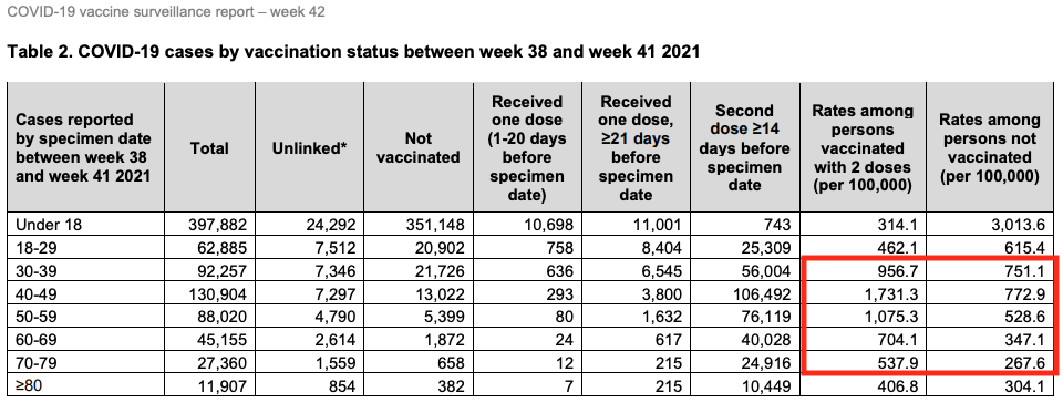 In den britischen Überwachungsberichten zu den Covid-19-Impfstoffen zeichnet sich ebenfalls ab, dass vollständig geimpfte Erwachsene ab einem Alter von 30 Jahren ein signifikant erhöhtes Risiko für eine Ansteckung mit SARS-CoV-2 haben könnten. Siehe hier auf Seite 13: In den mittleren Altersgruppen scheinen Geimpfte ein teils doppelt so hohes Infektionsrisiko zu haben.